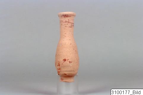 An unguentarium (pl. unguentaria) is a small container, typically made of clay or glass, for oil and perfumes. They are mostly associated with Hellenistic and Roman contexts, especially as grave goods. The so-called fusiform shape (from the Latin fusus, meaning “spindle”) is characteristic of Hellenistic unguentaria and is thought to have developed functionally from the lekythos. On the other hand, the so-called piriform shape (from the Latin pirus, meaning “pear”) is characteristic of the Roman era, especially the early Principate.
