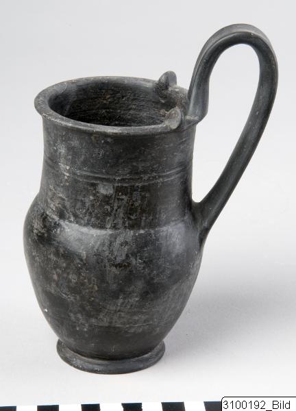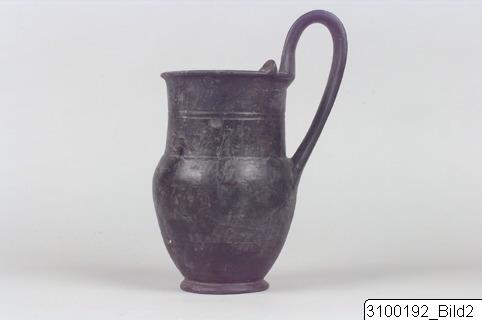• Rounded, horizontal rim; wide, almost cylindrical neck; rounded body; raised, splayed handle from rim to upper body; torus base. Bucchero with greyish black surface, fair sheen. Plastic disc protomes on each side of handle on rim; incised zigzag pattern on rim top; two grooves encircling neck; two grooves encircling lower body.