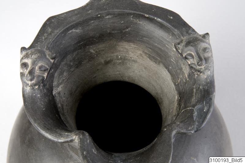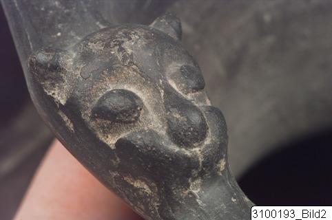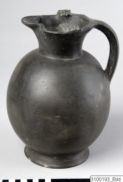 Trefoil mouth; splaying neck; globular body; broad, sliced handle from rim to mid-body; flaring base. buccheroid impasto with grey core, grey surface - shot with green and yellow at places - with fair sheen. Two lion’s head protomes on rim.