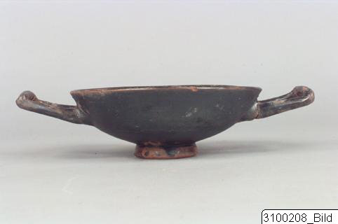 • Plain rim; rounded bowl; p-shaped handles on body; conical ring base. Yellowish red clay; black glaze, partly misfired to red. Bottom reserved.