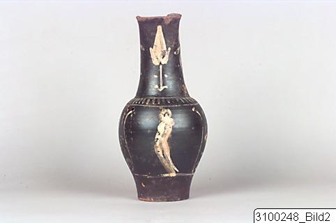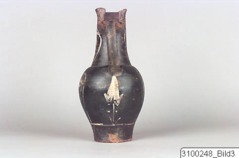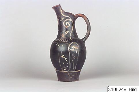 Beaked spout; neck with slightly flaring profile; rounded body, lower part almost cylindrical; sliced handle from rim to upper body; flat base. Reddish brown clay; black glaze; white paint. Flower on neck opposite handle flanked by acanthus scrolls on spout and neck; tongues on shoulder; human figure (?) on body opposite handle, ground line; scrolls on each side; stemmed flower below handle.