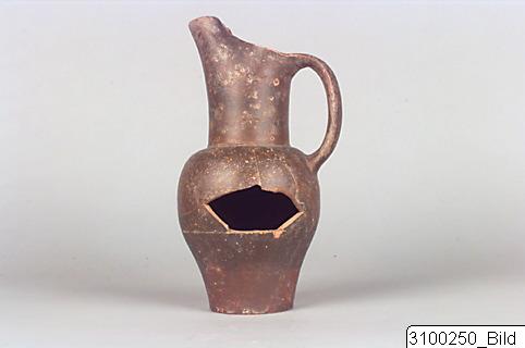 • Beaked spout; neck with straight profile; rounded body, lower part almost cylindrical; sliced handle from rim to shoulder; flat base. Reddish to yellow clay; brown glaze shot with red at places.