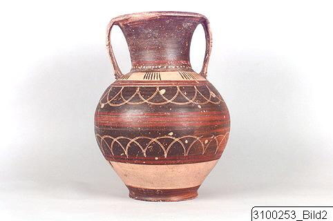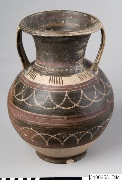 Everted rim with three shallow grooves; wide, flaring neck; ridge at junction between neck and shoulder; rounded, almost globular body; broad, vertical band handles from rim to shoulder; ring base. Fine, buff clay; buff slip; purple and dark brown paint (partly misfired to red). Inside of neck brown with purple band; rim and neck brown with purple band and row of buff dots; three groups of horizontal, brown lines on handles; handle edges brown; patches of brown paint on inside of handles; on shoulder groups of vertical, brown tongues on buff slip band; below, two purple bands within brown lines; on upper body broad, brown band with incised, pendant double interlocking semicircles (compass impressions visible at the beginning of arches); below, three purple bands separated by two brown lines; broad. brown band with incised, standing double interlocking semicircles; below, two purple bands framed by brown lines; lower body buff; base and area immediately above painted brown; bottom reserved.