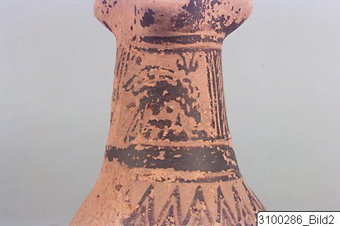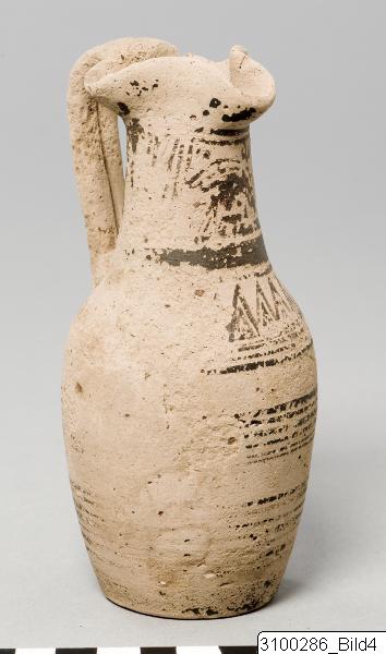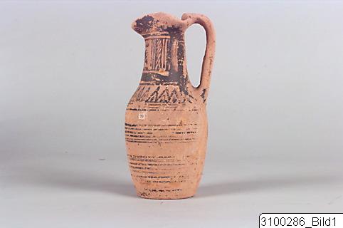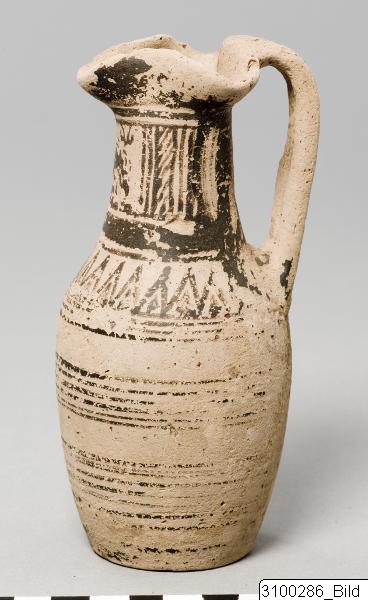 Trefoil mouth; splaying neck; elongated body, bulging at shoulder; vertical, double ribbed handle from mouth to shoulder; flat base. Reddish yellow clay; matt, buff slip; matt, black paint. Exterior of mouth and handle painted; neck encircled; metope on neck with animal (stag ?); standing triangles with solid triangle filling on shoulder; below, groups of lines encircling body.