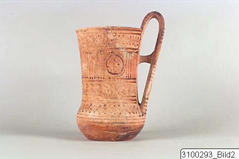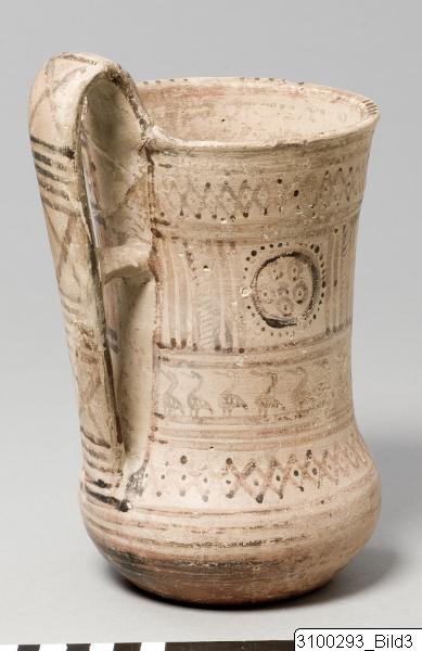 Bevelled rim; tall, wide neck with slightly concave profile; depressed globular body; thick, raised band handle with strut from rim to belly; flat base. Reddish yellow clay; lustrous, reddish yellow slip; lustrous, red to black paint. Inside of rim encircled; vertical strokes on rim; on upper neck dotted lozenge chain between horizontal bands; mid-zone with triglyphs (between triglyphs hatched zone or vertical lozenge chain) and metopes (opposite handle quatrefoil and cross-hatched triangles, other two metopes filled with central star surrounded by dotted circles, contained within circle surrounded by dots); on lower part of neck, row of hatched birds turned left between horizontal bands; on body horizontal, dotted lozenge chain; below three horizontal bands; lower body painted; on handle horizontal lines alternating with crosses.