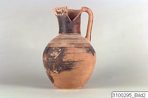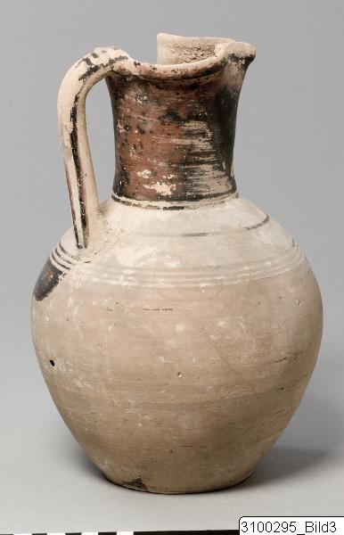 • Trefoil mouth; globular body; rounded handle from mouth to shoulder; flat base. Reddish yellow clay; matt, dark brown paint, misfired to red at places. Inside of rim encircled; neck painted; line encircling base of neck; line encircling shoulder; three lines encircling shoulder below handle; handle barred by mouth, three vertical lines on remaining part; body painted.