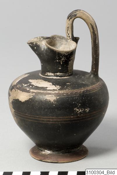 Trefoil mouth; short, cylindrical neck; almost flat shoulder; body tapering towards base; raised, double rolled handle from rim to shoulder; low, flaring base. Buff clay; lustrous, black and matt, purple and white paint. Entirely painted black, including inside of mouth; incised line encircling junction between neck and body; three purple lines between white lines encircling shoulder; three thicker purple lines on mid-body; base painted purple; bottom reserved.