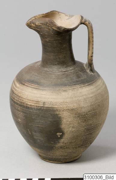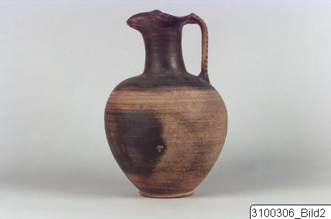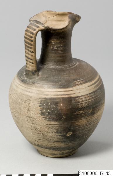 • Trefoil mouth; rather tall neck with slightly concave profile; ovoid body; broad band handle from mouth to shoulder; low ring base. Buff clay; lustrous, dark brown paint, largely misfired to reddish brown. Exterior painted except inside of handle and three reserved bands encircling upper body below handle; horizontal lines on handle.