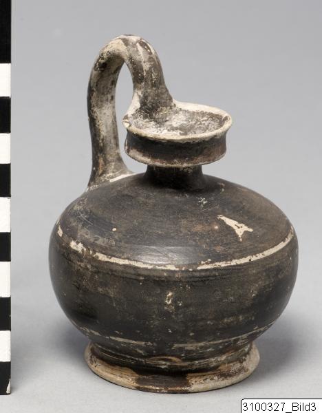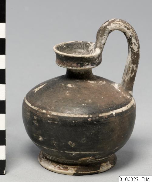 Round, deep mouth with everted rim, concave profile; short, narrow neck; convex body with sloping, well-defined shoulder; raised, sliced vertical handle with central ridge from rim to shoulder; ridge at junction between body and base; flaring ring base. Buff clay; lustrous, black and matt, white and red paint. Inside of mouth and exterior of vessel painted black; lower part of mouth edge red; white mark (resembling an A) on shoulder opposite handle; one white band between two red ones below handle; white band on lower body; thinner band right above base; lower part of base red; bottom reserved.