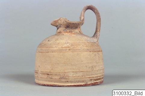 Flat-bottomed oinochoe. Trefoil mouth; short, narrow neck; raised band handle from rim to shoulder; rounded body with broad bottom; groove marking junction between body and base. Buff clay; semilustrous, buff slip; lustrous, dark brown to black and matt, red paint. Mouth, neck and handle black; three bands of uncertain colour below handle; two bands of uncertain colour above base; base red.