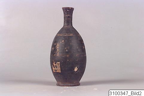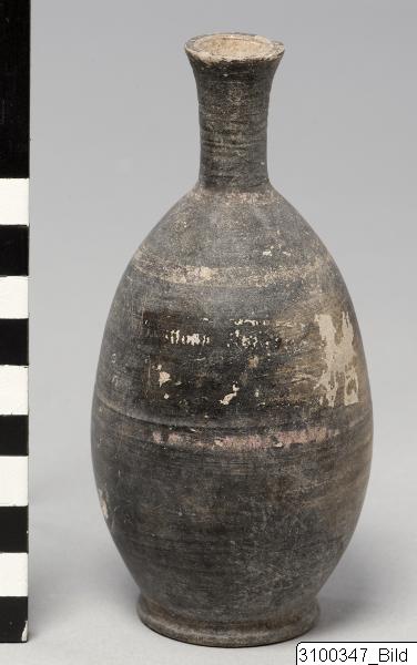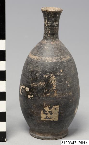 Everted rim with flat top; narrow neck; elongated ovoid body; low ring base. Light brown clay; semilustrous, black and matt, red and white paint. Exterior black; red band below junction between neck and body; white band encircling shoulder; one red band encircling mid-body and one at junction between body and base; bottom reserved.