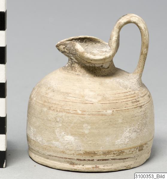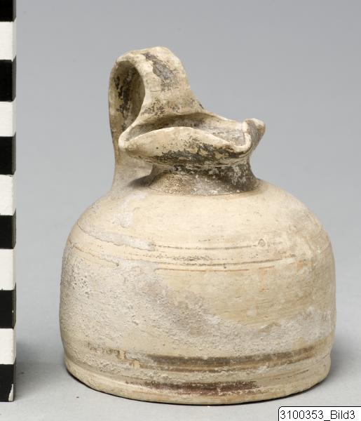 • Flat-bottomed oinochoe. Trefoil mouth; short neck; sloping shoulder; body with almost straight wall; raised band handle from mouth to shoulder; broad, flat base. Buff clay; black paint; added red. Mouth, neck and handle black; two or three red band on body below handle; one black and one red band above base; base black.