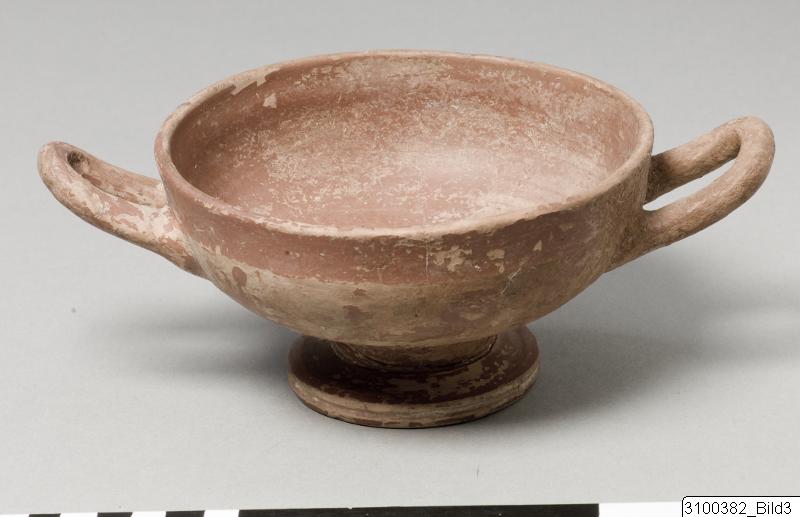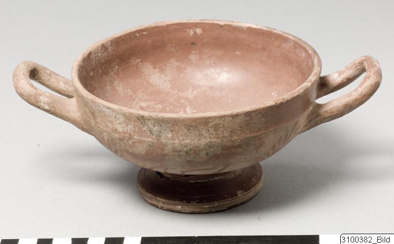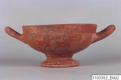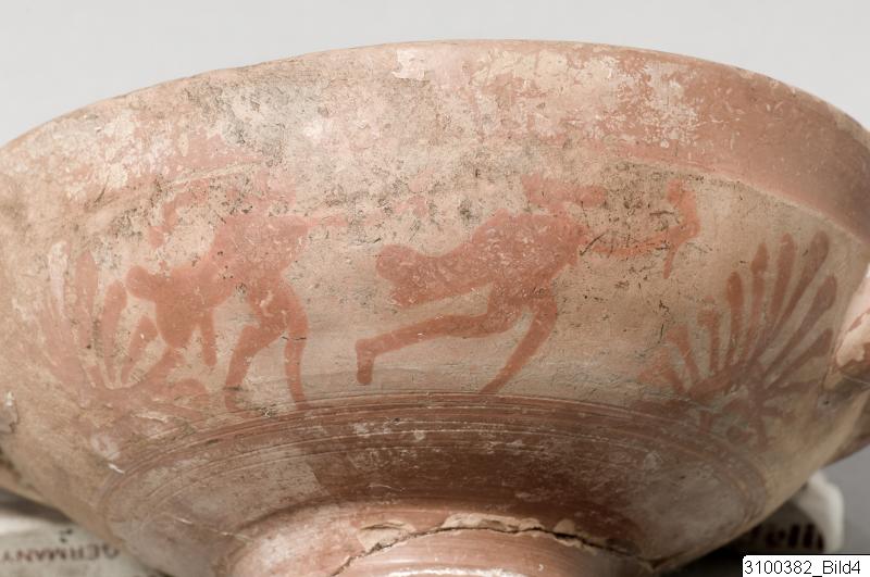 Plain rim; rounded body; raised, rounded, U-shaped handles at mid-body; thick, short stem; disc base in two degrees. Yellowish red clay; lustrous, red paint (probably misfired). Interior painted, except reserved band at inside and top of rim; lip and handles painted; frieze in handle panel on both sides with two figures in silhouette, holding unidentifiable objects (in one case possibly a horn), flanked by a palmette fan on each side; lower body, stem and base painted; underside of base painted; on bottom a central dot encircled by a narrow band.