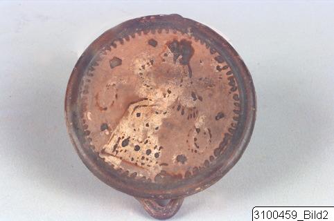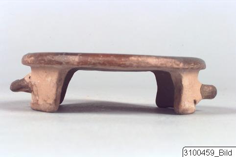 Stand with flat top; rounded rim; two feet; one rounded, horizontal handle on each foot. Light brown clay; brown slip (top); greyish brown paint; added white; polished (top). On the top a winged, female figure (Nike ?) facing left, wearing a patterned white dress, holding a wreath in each hand; blobs/dots as filling ornaments around the figure; dots close to the rim; rim and outside of handles painted.