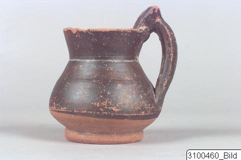 Plain rim; everted neck; biconical body; vertical, flattened handle with wish bone top/thumb rest; ring base. Orange clay; dark brown to reddish brown glaze. inside of rim, handle and exterior painted down to lower body.