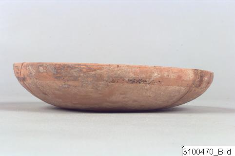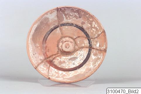 Inverted rim; low, wide and convex body; rounded omphalos on inside, concave at bottom. Yellowish pink clay; white slip; lustrous, black to red paint. Dot and band on omphalos; one band on floor and one on outside of rim.