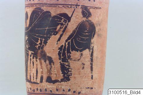 Deep chimney mouth; moulding at base of mouth; narrow neck; almost flat shoulder; vertical band handle from neck to shoulder; cylindrical body, tapering downwards; disc base in two degrees. Red clay; black to brown glaze. Inside and outside of mouth painted; on shoulder one row of bars and one of rays; outside of handle painted; right below shoulder on one side of body double row of dots between narrow bands; on body a quadriga (?) with charioteer, two other figures (one of these partly erased) standing behind the horses and a seated figure holding a staff (?) in front of the horses – incisions; below figured scene two rows of dots between narrow bands; below this two groups of wet-incised lines; lower body, base top and lower edge of base painted.