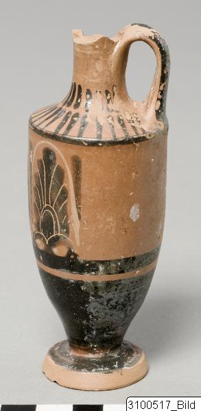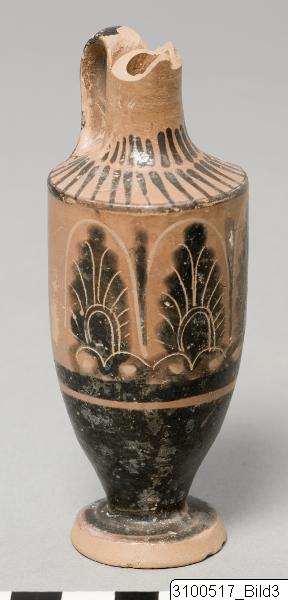 Narrow neck; sloping shoulder; cylindrical body, tapering downwards; band handle from neck to shoulder; disc base. Red clay; red ochre wash; brown to black glaze; added white. One row of bars and one of rays on shoulder; outside of handle painted; on body three palmettes and scrolls separated by lotus buds (?) and white arcs – added white, incisions; below palmettes a black band; lower body and base top painted.