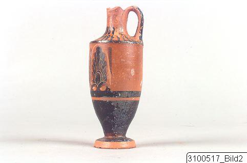 A lekythos (pl. lekythoi) is generally a taller, cylindrical vessel with a small, deep mouth, narrow neck and a single handle. However, many variants of the shape do exist, including the rounded, squat form and the ovoid “Deianeira” form, all in various sizes. They were used for the storage of oils and are especially associated with funerary contexts. Towards the end of the fourth century BC they were functionally replaced by the unguentaria.
