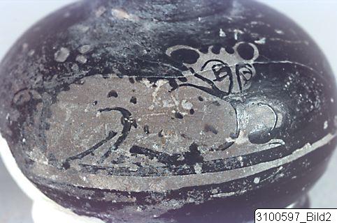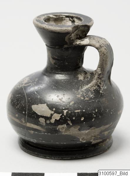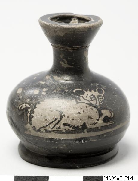 Cup mouth; short, narrow neck; vertical, flattened handle from neck to shoulder; depressed globular body; ring base. Clay misfired to grey; black glaze. On body opposite handle a sheep (?); reserved line below; bottom reserved.