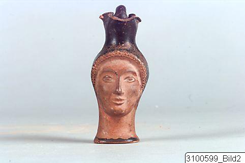 • Trefoil mouth; short neck; vertical, rounded handle from mouth to shoulder; body shaped like female head and neck; flat base. Reddish brown clay; black glaze; added white. Mouth, handle and hair black glazed; white ivy wreath on hair; small, plastic dots marking curls around face; eyebrows marked with black, eyes filled in with white; black band encircling base; bottom reserved.