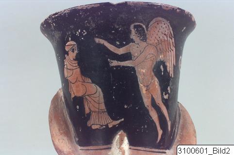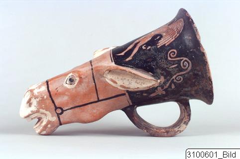 • Everted rim; wide neck; body in the shape of a donkey’s head with plastic ears, mane, eyes, nostrils and mouth; vertical band handle with raised sides from neck to mid-body. Red clay; ochre wash; black glaze; white and red paint. Interior black down to lower body; rim, neck and handle black; seated woman and Eros on one side of neck; tendrils on both sides of handle; bridle painted in black; eyes ... Visa hela