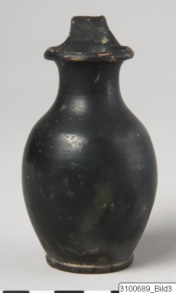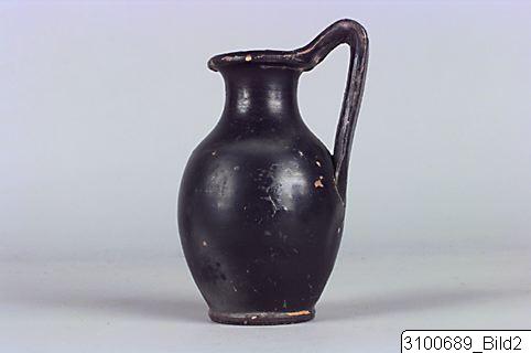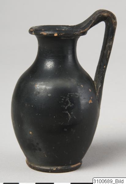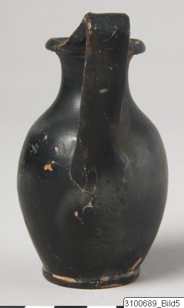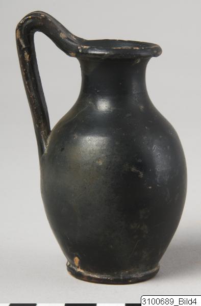 Round mouth with thickened, everted rim; concave neck; ovoid body; raised, broad band handle from rim to shoulder; disc base with concave underside. Reddish yellow clay; black to grey glaze. Underside reserved.