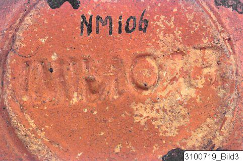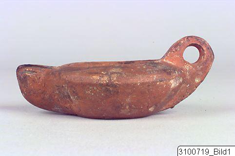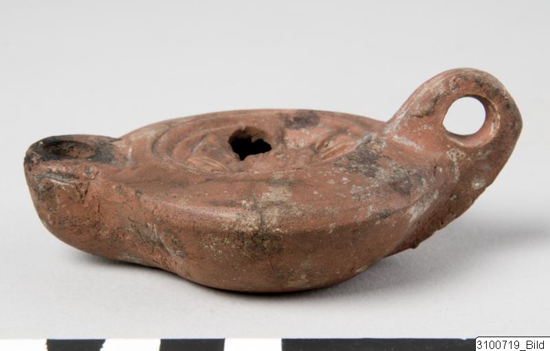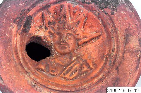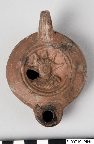 • Concave discus with asymmetrically located opening; discus surrounded by two incised lines; body with convex profile; rounded nozzle; grooved handle; groove indicating base; flat base. Reddish brown clay; matt, red slip. Plastic decoration on discus - frontal bust of the sun-god Sol with a radiate head and a mantle draped around his left shoulder; ‘FRONIMI’ or ‘ERONIMI’ impressed on the underside.