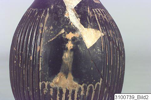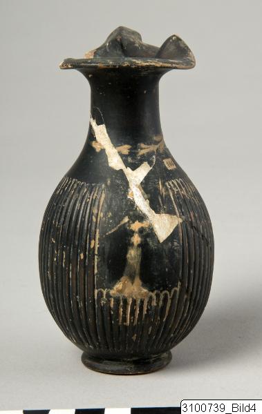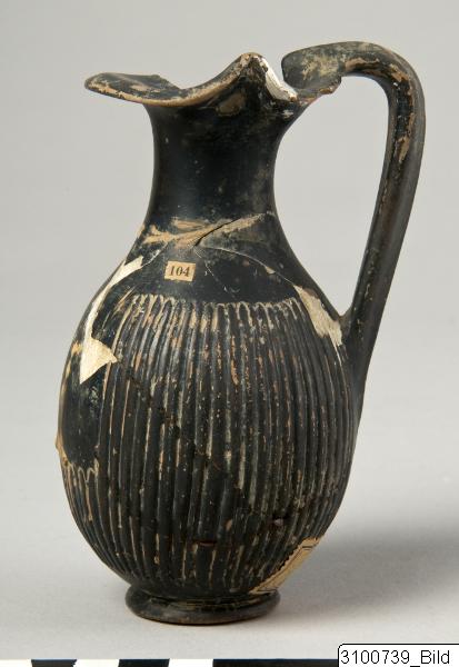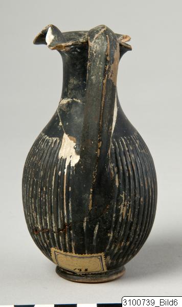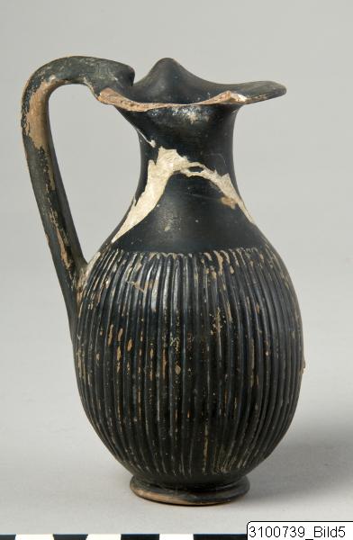 • Trefoil mouth; concave neck; ovoid body; vertical band handle with central ridge from rim to upper body; flaring ring base. Brown clay; black glaze; added paint, originally gilded (?). Ribbed wall, except below handle and a panel on the front. A wreath around the neck; a thymiaterion in the panel; underside reserved.