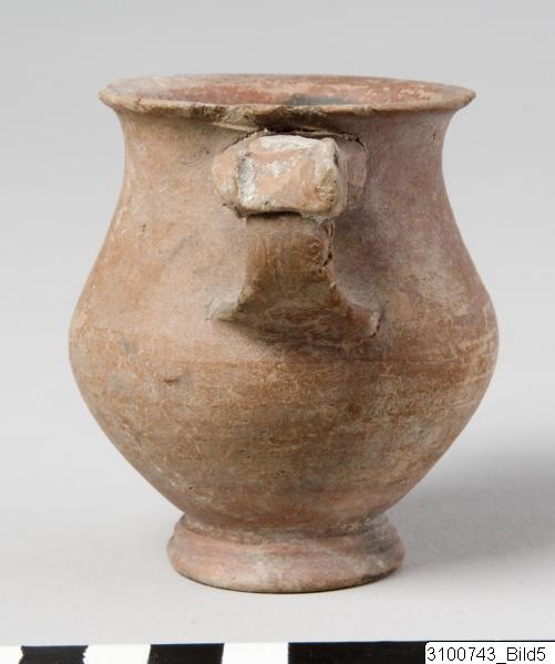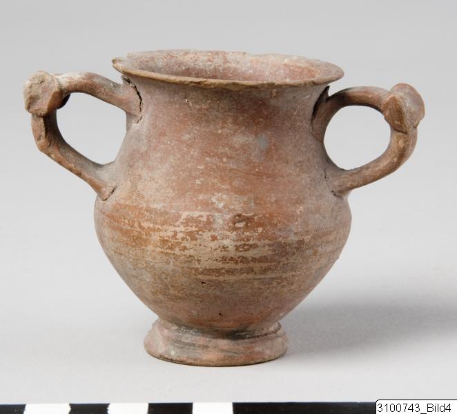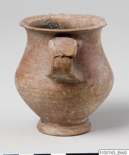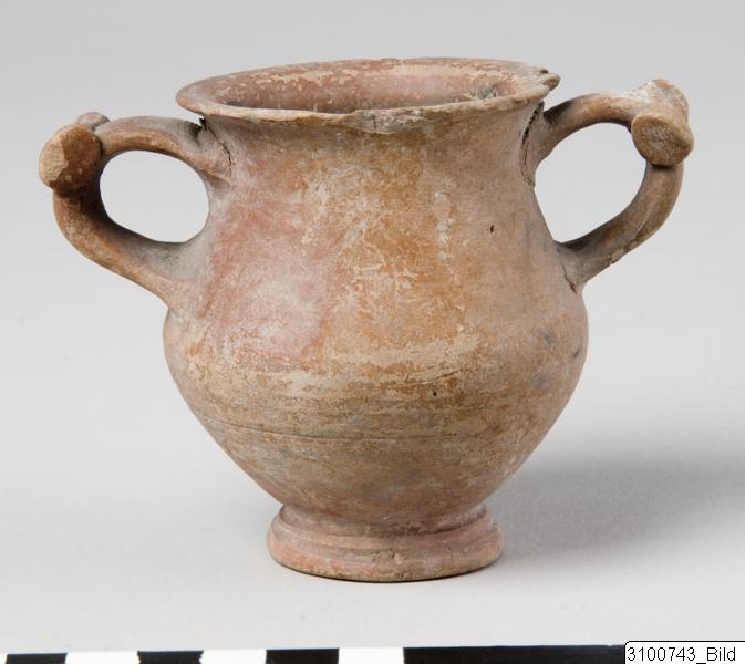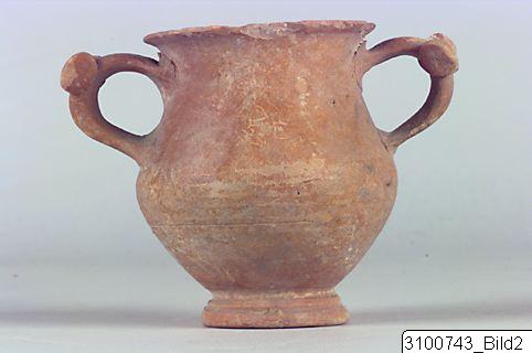 Everted rim; concave neck; convex body, bulging at shoulder; vertical band handles with flattened rotelle as thumb-rest on top of each; flaring ring base; central nipple on underside. Yellowish red clay; black glaze, misfired to red on outside; underside reserved.