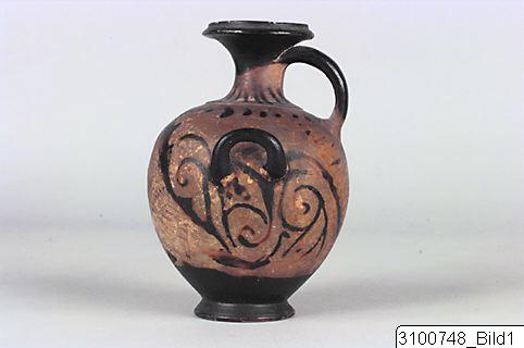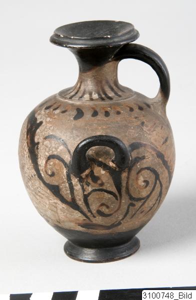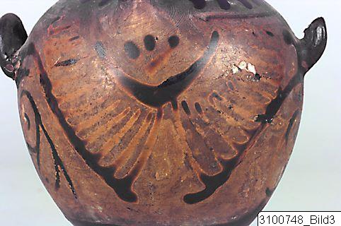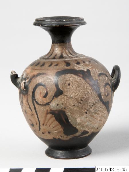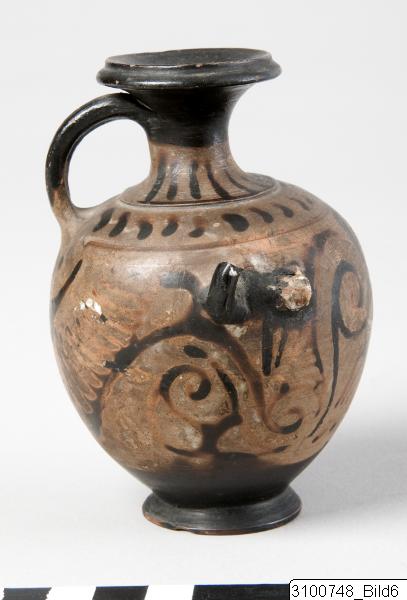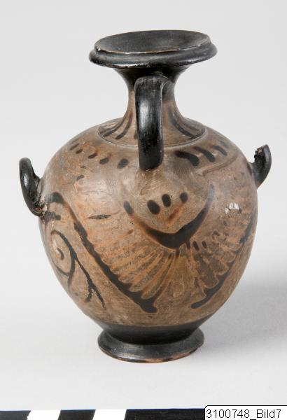 Broad, moulded rim; narrow, concave neck; moulding at base of neck; piriform body; one flattened, vertical handle from neck to shoulder and two horizontal, canted handles below shoulder; flaring ring base; central nipple on underside. Red clay; black glaze, partly misfired. Mouth, upper part of neck and handles black; black tongues on neck; on shoulder a row of blobs between bands; on body a large owl flanked by scrolls; below vertical handle a large palmette; most part of underside reserved.