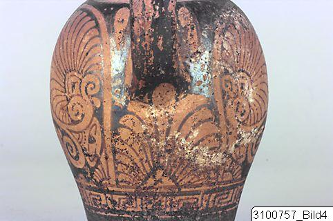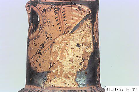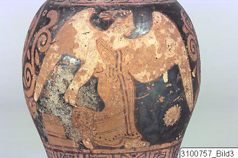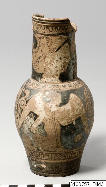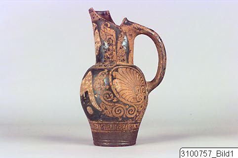Beaked spout; cylindrical neck; rounded body, lower part cylindrical; vertical, flattened handle from rim to shoulder, with rotelles at rim; flat base with grooved underside. Reddish clay; black glaze with metallic sheen; added white paint. On spout egg-pattern flanked by waves; on each rotelle a rosette; outside of handle black; on neck a female head with white skin, wearing a kekryphalos, facing right – flanked by palmettes and tendrils; egg pattern on shoulder; on body a winged, female figure walking to the right – behind her is an altar; she is flanked by scrolling tendrils and and large palmette fans; beneath handle a palmette; below this a meander, two times interrupted by a rectangle with a cross and four chevrons; lower body black; resting surface and centre of underside reserved.