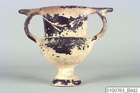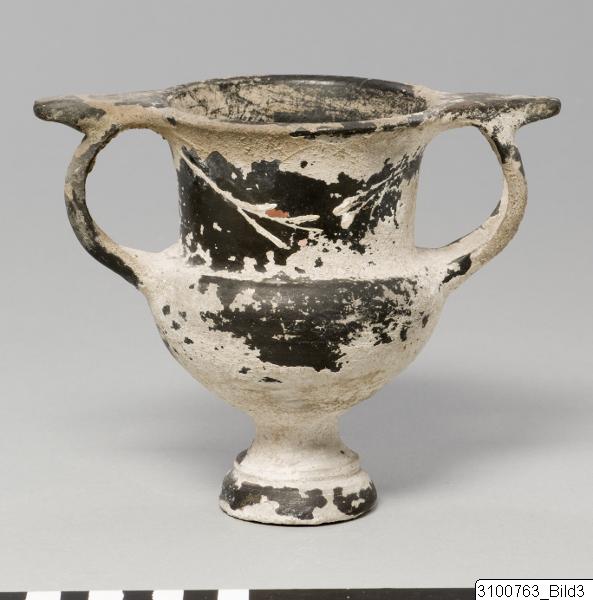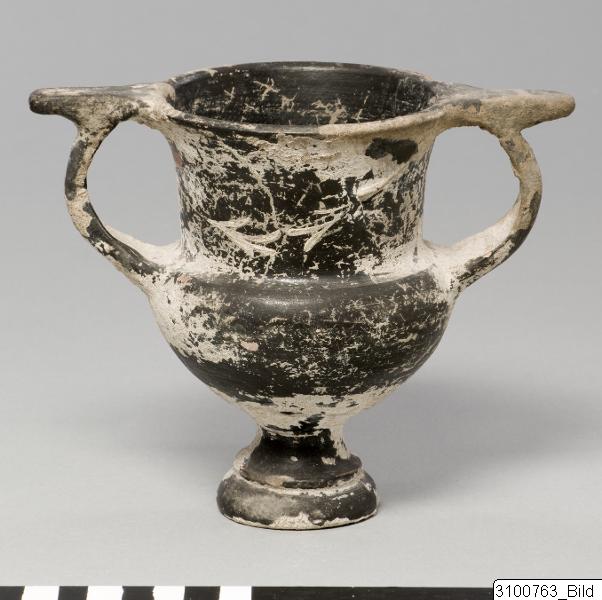Everted rim; concave neck; groove at junction between neck and body; bulging shoulder; vertical handles with elongated, roughly triangular spurs and convex profile, from rim to shoulder; body tapering downwards; hollow stem; base on two degrees. Red clay; black glaze; added white. Vessel totally black with white sprays in added clay encircling neck.