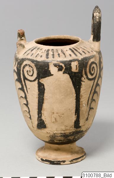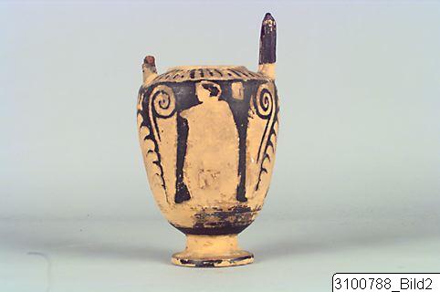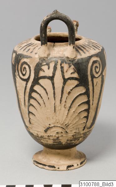 Small, inverted rim; sloping shoulder; almost ovoid body; upright horseshoe shaped handles at shoulder; concave stem; disc base. Porous, pale reddish yellow clay; black glaze. Lower part of handles reserved; rays on shoulder; on both sides of body a draped youth facing left, in the upper field to the right is a “window” (?); both figures are flanked by triangular plamette fans (?) and coiling tendrils; two small and one large palmette fan beneath each handle.