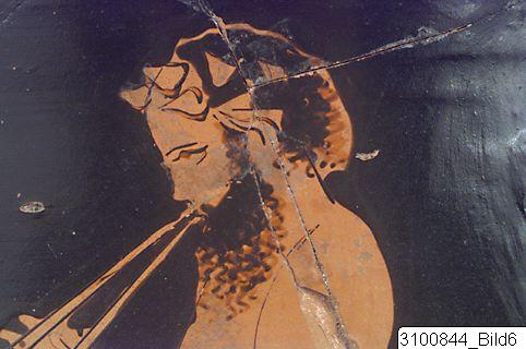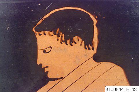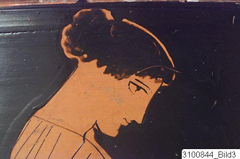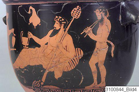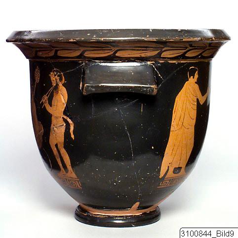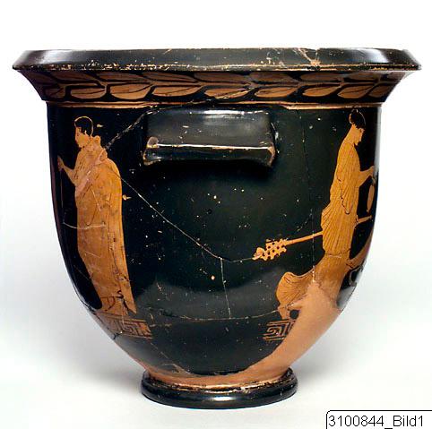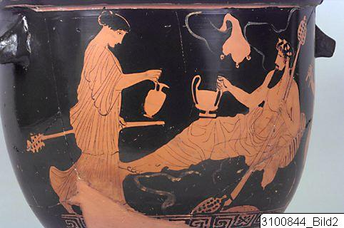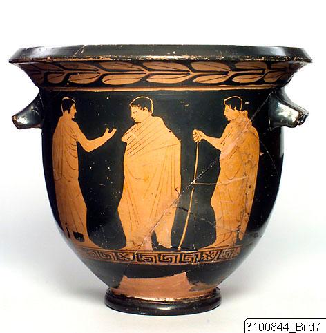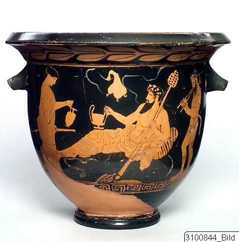 Bell krater. Wide, flaring mouth with overhanging, bevelled rim; groove at junction between mouth and body; deep body with almost straight upper wall and rounded, tapering lower wall; rectangular handles at upper body; grooved ring base. Yellowish red clay; black glaze; red wash (on underside). Two reserved bands on inside of mouth; laurel branch between bands encircling the outside; A: bearded Dionysos, wearing an ivy wreath, reclines on a bed with striped pillows; he holds a thyrsos in his left hand and a kantharos in his left; a maenad to the left, holding a thyrsos and wearing a loose chiton, is about to pour him some wine from an oinochoe; to the left a bearded satyr playing the double pipe; in the upper field a suspended wine-skin; below a pine-cone; B: three conversing youths in himatia, one of them holding a staff; below figures on both sides a border of meanders and dotted saltier squares; underside resrved.