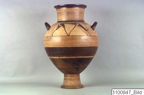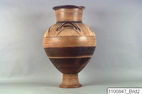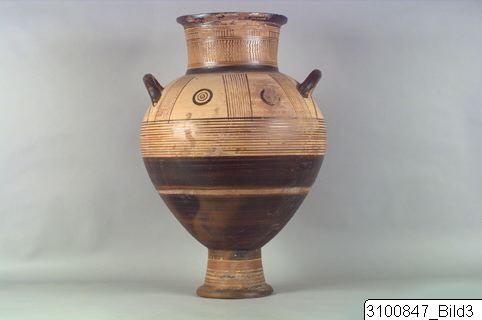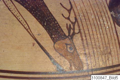 Everted rim; slightly flaring neck; ovoid body; horizontal, rounded handles at neck; conical foot with torus base. Reddish brown to yellowish red clay; pinkish yellow slip; lustrous, brown to black paint, partly misfired to red; added white. Brown band on inside of neck; on rim top four groups of four bars each; one broad, brown band on outside of rim/neck top and one at base of neck/shoulder; on neck a band of zigzag lines alternating with vertical lines, framed by bands; below this a broad band of vertical, wavy lines, framed by bands; on shoulder a metope frieze, delimited by groups of parallel, vertical lines; a grazing deer stag with long neck and legs in the large metope on side A; the deer’s head, right foreleg, belly, tail and hind legs are drawn in outline and filled with brown dots; the rest of the body is brown with white dots; three concentric circles with a central dot in each of the two smaller metopes on side B; brown arcs in the two handle metopes; outside of handles brown; fourteen bands encircle the belly beneath the metope frieze; remaining part of body and upper part of foot brown, except for a reserved band at lower body; reserved area on lower part of foot with alternating straight and wavy, horizontal lines.
