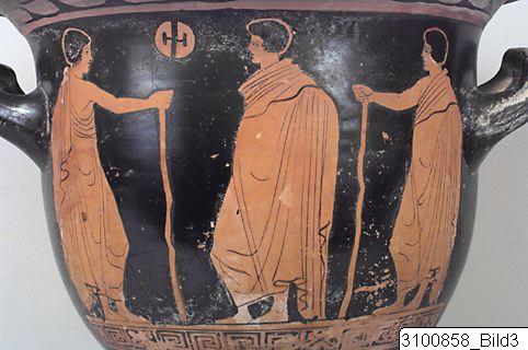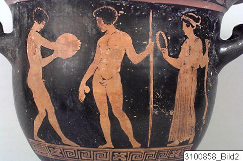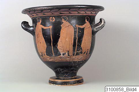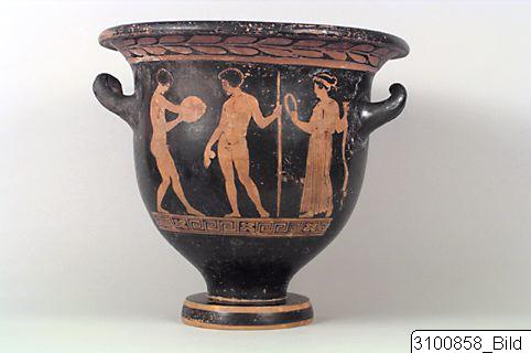 Bell krater. Wide mouth with overhanging rim; upper wall gently curving in above handles; rolled-back handles at upper body; lower body tapering to a short stem; groove at junction between stem and base; hollow disc base with convex edge. Red clay; black glaze. On inside of rim two reserved bands; on outside a reserved laurel branch between bands; A: to the left a naked youth, facing right, holding a discus; in the middle another naked youth, standing en face, holding a spear in his left hand and a jumping weight in his right; to the right a woman in chiton and fillet, holding a wreath in her right hand and a fillet in her left; B: three youths in himatia, the one to the left and the one to the right holding staffs; in the upper field to the left a set of stylised jumping weights; handle panels reserved; on both sides a border of meanders and saltier squares below figures; groove at junction between stem and base reserved; two reserved bands on edge of base; underside reserved.