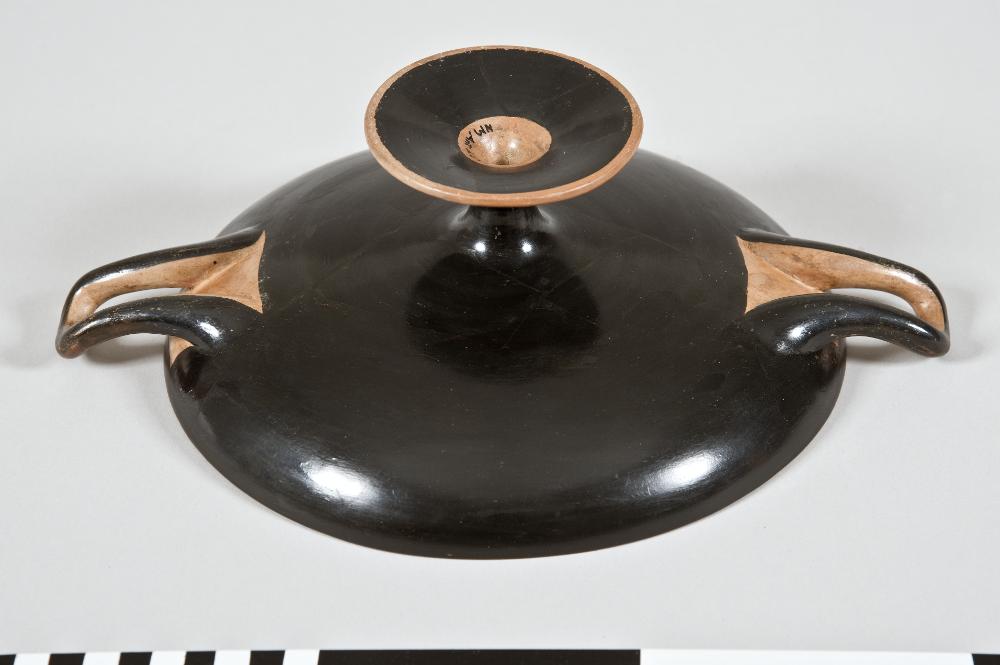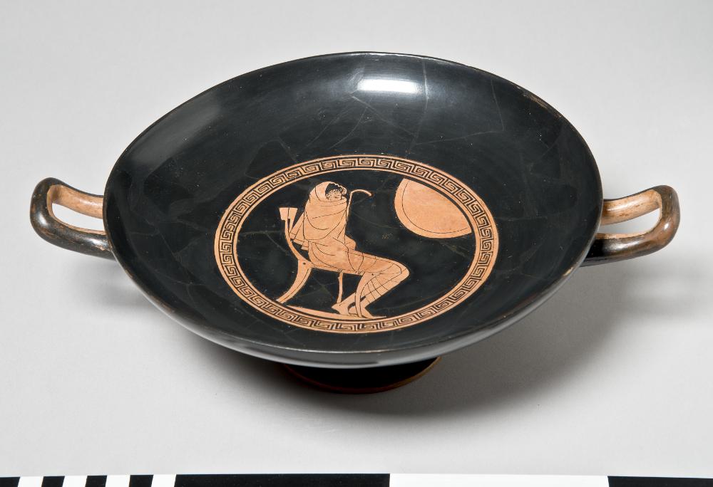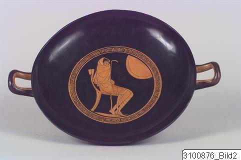 Plain rim; wide, very shallow bowl; P-shaped handles below rim; concave stem; slightly stepped disc base. Red clay; black glaze; ochre wash. On floor centre a man (Achilles), completely wrapped in a himation, is seated on a klismos; he holds a staff in his left hand; in the upper field to the right part of a suspended, circular shield is visible; the backrest and the back legs of the chair are shown in a perspective view; a meander border between reserved bands surrounds the tondo; inside of handles and handle panels reserved; reserved band on base top; reserved edge of base/band on underside; reserved centre on underside.