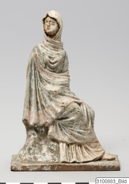 Seated woman, wearing a blue and pink chiton and a himation of same colours that covers her head and body down to the knees; she sits on a rock (?) with crossed legs, only one foot visible; her head and upper body are turned to the right, she holds up her right hand under the himation, while the left one is completely hidden; on the backside part of the himation hangs down and there is a square opening in the ‘rock’; mounted on a roughly rectangular, perforated base. Brown clay; white, blue and pink paint.