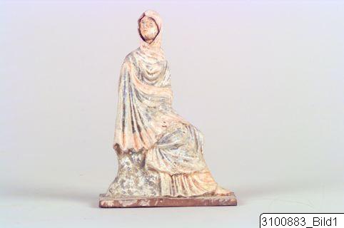 Figurin av en ung flicka som sitter på en klippa, med sin långa chiton hopdragen kring benen och med överkroppen insvept i en mantel, som även dragits upp kring huvudet, vars hållning tyder på att figuren kan ha varit grupperad med en annan statyett.