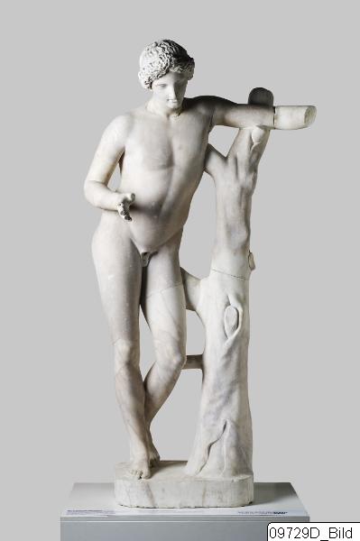 Head and torso originally not connected. Roman copy of greek original from the fourth century B.C. by Praxiteles. On photograph (pl. 91, facing page 61) from the 1930 Christie's catalogue for the auction of Lansdowne Collection, the left hand was still attached, as was a fig-leaf covering the genital area.
