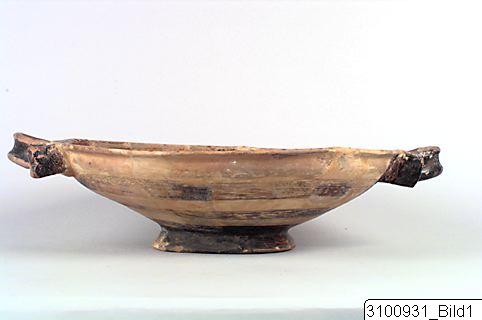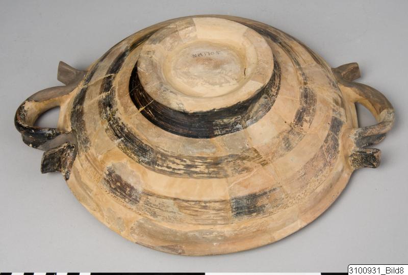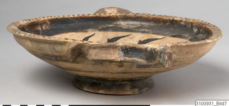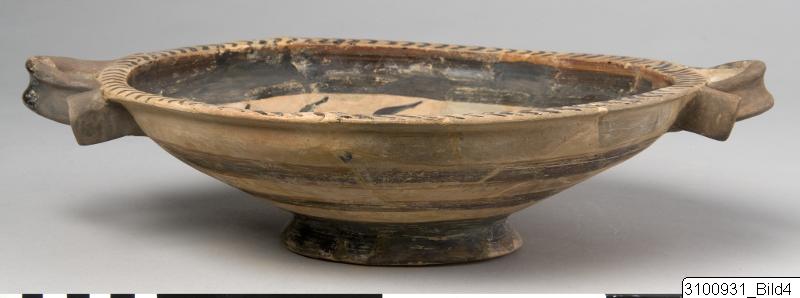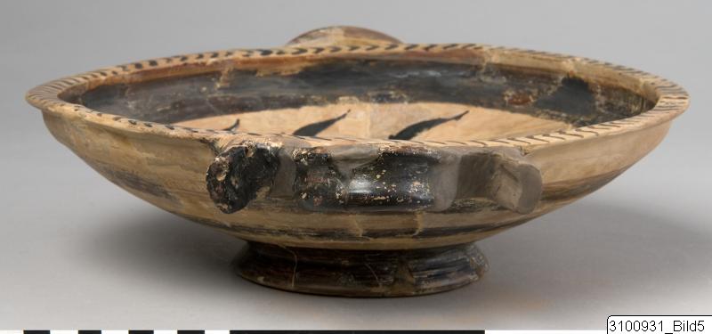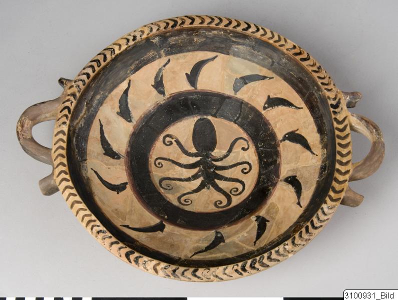 Horizontal rim; wide, shallow bowl; thick, horizontal reflex handles at upper body; flaring base. Yellowish buff to pale brown clay; yellowish brown slip; lustrous, black to brown paint; added red. On floor centre a reserved medallion with an eight-armed octopus, surrounded by a broad, black and red band; above this a reserved zone with twelve dolphins, surrounded by a broad, black band; chevrons on rim top; outside of handles painted; on outside of bowl three broad bands; base painted.