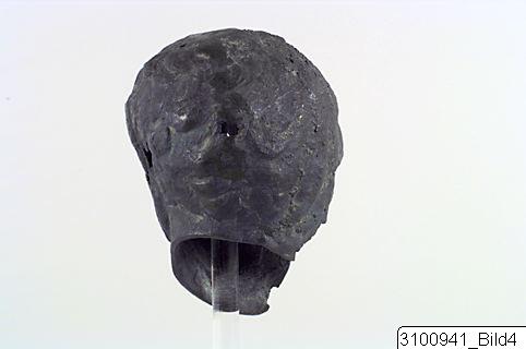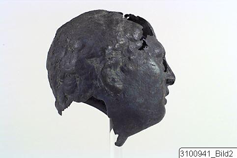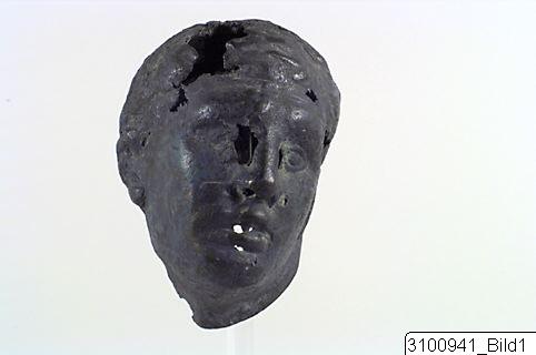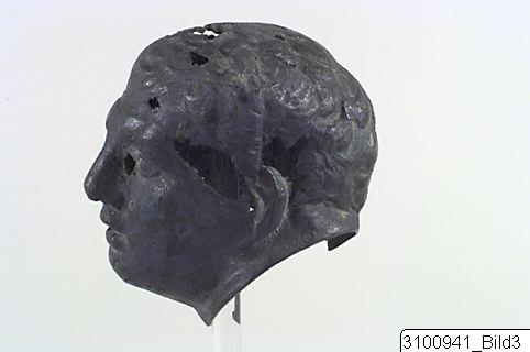 Head of a young athlete (probably a boxer), tilted to the left; he wears a cap made of leather straps over the short and curly hair; the ears are slightly swollen; his nose is straight and the lips are slightly parted. Hollow. Small, flaring rim at base of the head.