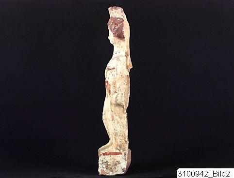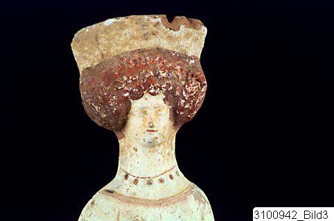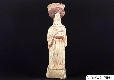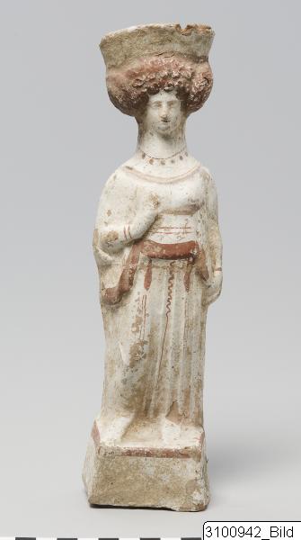 Standing, female figure, holding her right hand in the height of her breast; her hair is curly and put up in a very voluminous hairdo; she wears a white polos, reddish brown necklace, red bracelets and white peplos with red borders; her skin is white, her hair and lips red; the folds of the dress are indicated by red strokes; a red band along the edge of the base;the back side is unworked and has an elongated, roughly rectangular opening. Reddish brown clay; white slip; red paint.
