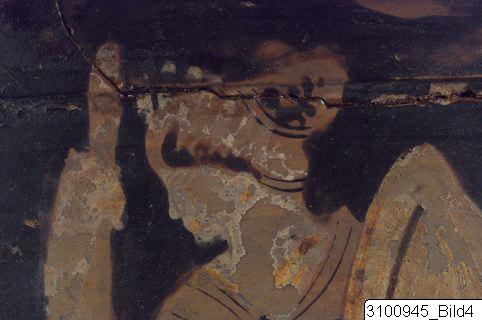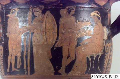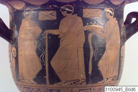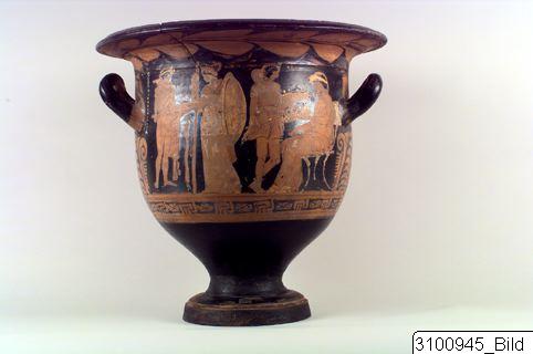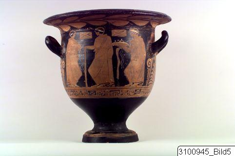 Bell krater. Wide mouth; grooved, overhanging rim; rather tall body; raised, horizontal handles at upper body; lower body tapering to a short stem; grooved base. Reddish brown clay; black glaze; added white and yellow. Reserved band on inside of rim; reserved laurel branch on outside; A: to the left Herakles, dressed in his lion’s skin, holds his club in his right hand and a phiale in his left; to his right Athena with shield and spear, wearing a kekryphalos, chiton and aegid; in the upper field to the left a string of white beads; between the couple a suspended fillet with added white; to the right of Athena, Hermes in short chiton, chlamys, boots and petasos holds his staff in his right hand and a phiale in his left; to the right Dionysos in stephane and a draped himation, is seated on a white klismos and holds up a phiale; B: three standing youths in himatia and white stephanai/fillets; the youth in the centre holds a staff with white bands attached to it, the one to the right a phiale with added white and yellow, and a fillet with white bands; in the upper field two cistas decorated with white; reserved handle panels; rays at base of handle attachments; below handles large palmettes and tendrils; below figures an encircling band of meanders and dotted saltire squares.