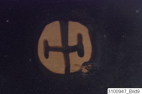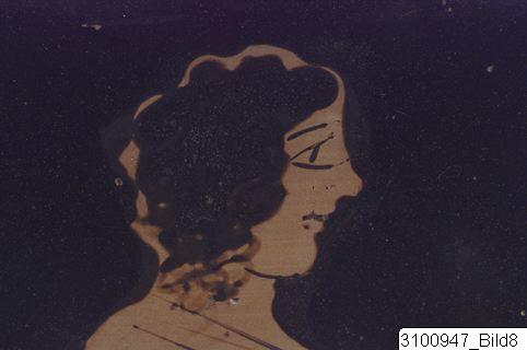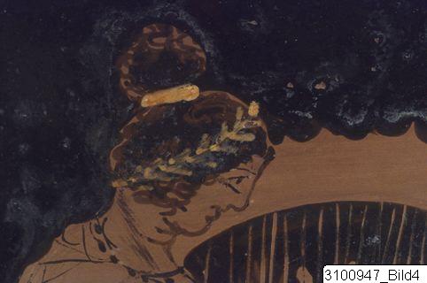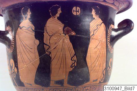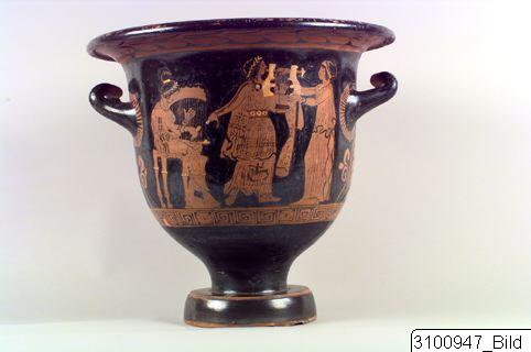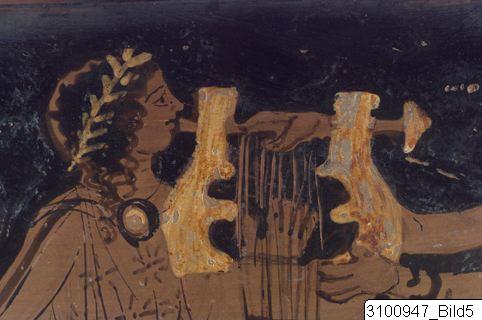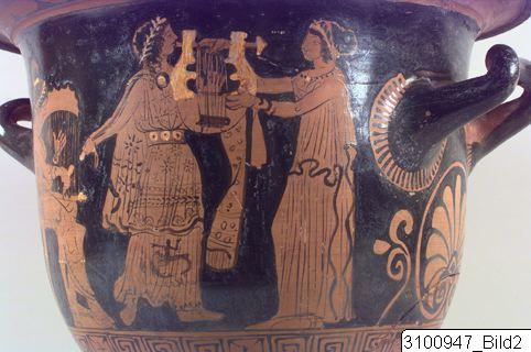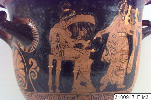 Bell krater. Wide mouth with overhanging rim; rather slender body, curving out above handles; rolled-back, horizontal handles at upper body; lower body tapering to a stem; grooved base. Pinkish to pale brown clay; black glaze; reddish brown wash; added yellow paint. One reserved band on inside of mouth and one on rim top; on outside a reserved laurel branch between bands; A: in the centre of the picture Apollon, standing in three three-quarter view, his head seen in profile; he wears a yellow wreath, a decorated cape, sandals, a broad belt with yellow circles and a richly decorated musician’s chiton with long sleeves, embroidered with stars, palmettes, chevrons, cable pattern and the picture of a figure on horseback; he holds his partly white kithara erect (by a strap around his left wrist), stopping the strings with the fingers of his left hand; he holds a plektron in his right hand; a decorated scarf hangs down from the kithara; to the right of Apollon a woman standing in profile, holding on to the kithara with her both hands; she wears a fillet, a stephane, a necklace, bracelets and a loose peplos; to the left of the god a woman, seen in profile, seated on a stool – details on the stool are marked with yellow dots or strokes of diluted glaze; her feet are resting on a small footstool; she is playing a small harp, and holds a plektron in her right hand; she wears a yellow wreath, a decorated chiton, bracelets and sandals; her hair is tied up with a yellow fillet; B: three standing youths in himatia; in the upper field to the right a pair of stylized jumping weights; below figures an encircling border of meanders and saltire squares; handle panels reserved; rays at base of handle attachments; below both handles a palmette within an arc flanked by flowers; two reserved bands encircling base; underside reserved.