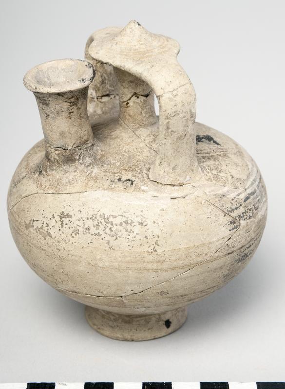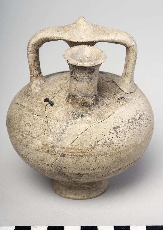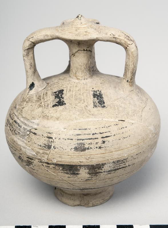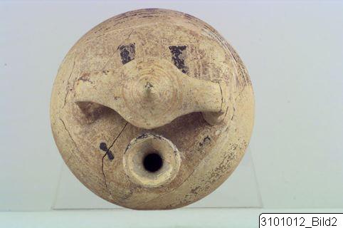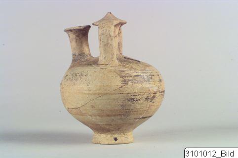 • Narrow false neck with tall cone false mouth; slightly rounded U handle; cylindrical spout with flaring rim; depressed globular body; tall, flaring base. Yellowish buff clay; lustrous, buff slip; brown to black paint. Concentric circles on false mouth; stacked rectangles with solid centre on shoulder; U:s on handles; on body three groups of bands alternating with black areas; lower body reserved; ... Visa hela