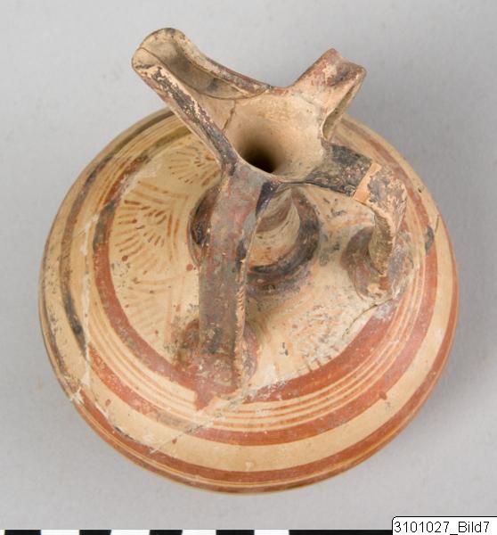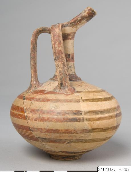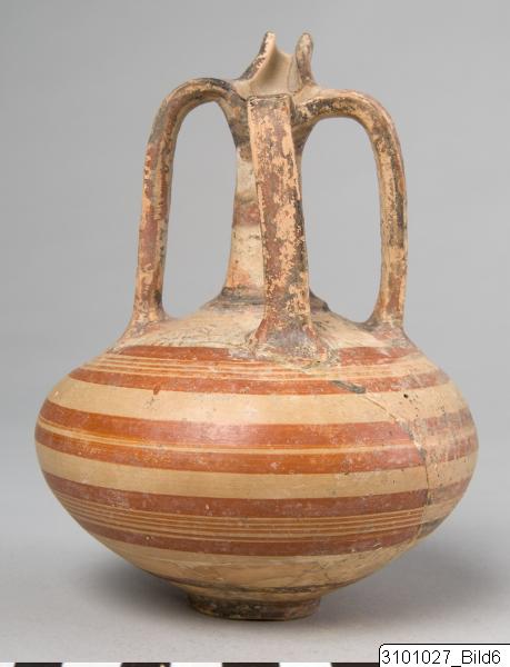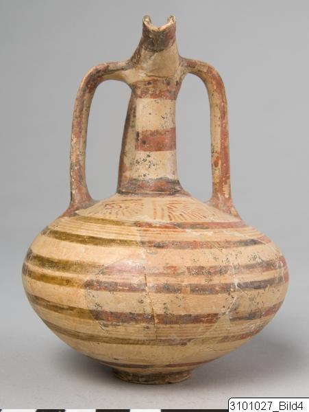 Beaked spout; tall neck; three vertical handles with raised sides from rim to shoulder; depressed globular body; small ring base. Lustrous, buff slip; lustrous, orange to black paint; traces of tin (?). Edges of spout painted; handles painted; neck banded; flowers (FS 18) in shoulder circle; body banded.