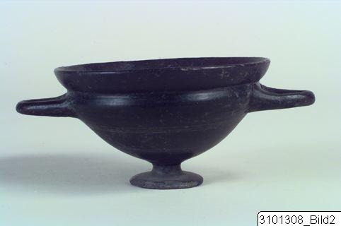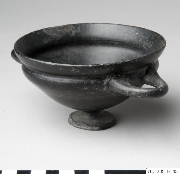 • Everted, offset rim; almost biconical bowl; rounded, horizontal handles on upper body; short stem; disc base. Dark grey to black fabric with fair sheen. Two groups of horizontal, incised lines encircling body.