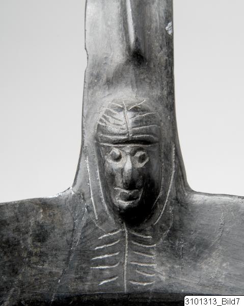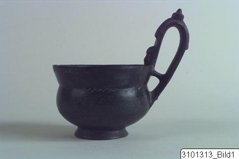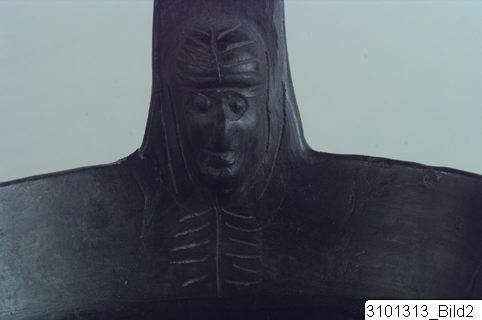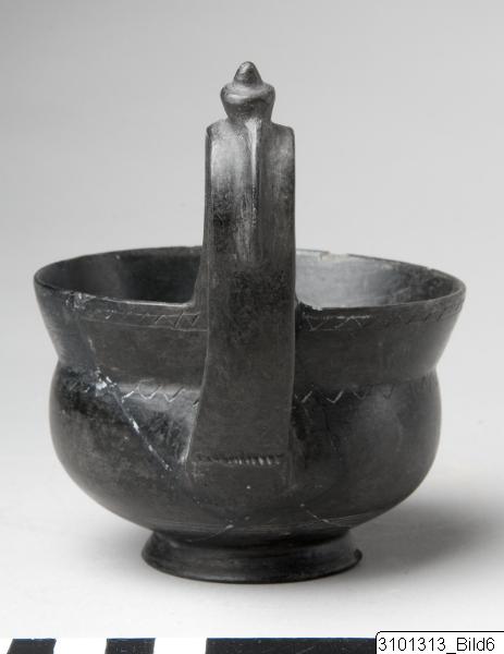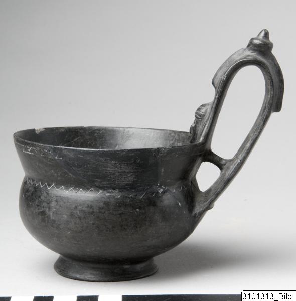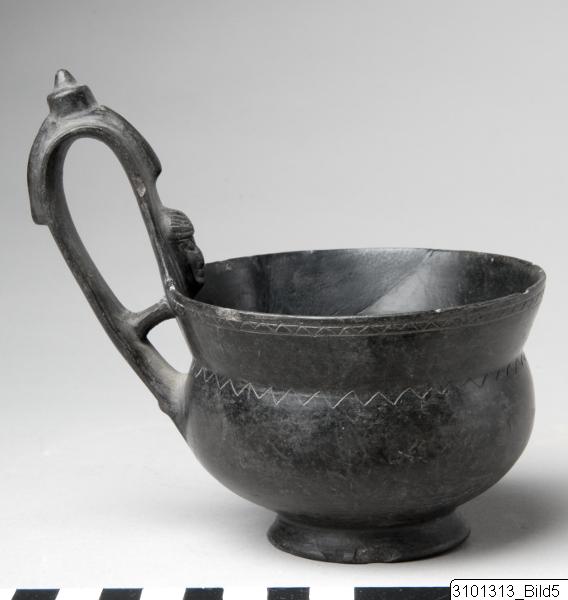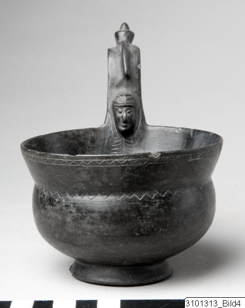 Projecting rim; rounded bowl; raised band handle with reinforcing strut from rim to mid-body; flaring ring base. Dark grey to black fabric with fair sheen; plastic and incised decoration. Two incised, horizontal lines filled with zig-zag pattern encircling rim; zig-zag pattern at junction between rim and body; five to six incised, narrow lines on lower body; on lower handle attachment a small, horizontal ridge with incised, vertical lines; ridge hanging down on both sides from handle top, a pointed knob at the highest point; a head in relief on handle above inside of rim — incised lines indicating hair; incised “fish bone” below the head.